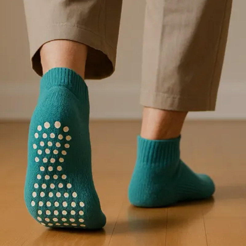 “Non-slip socks” are socks designed with outsole traction and fit-stability features intended to reduce unintended foot slip on defined surfaces during defined movements, with performance that remains predictable across the expected wear and wash cycle, and with known failure modes that can be managed through sizing, use boundaries, and replacement rules.